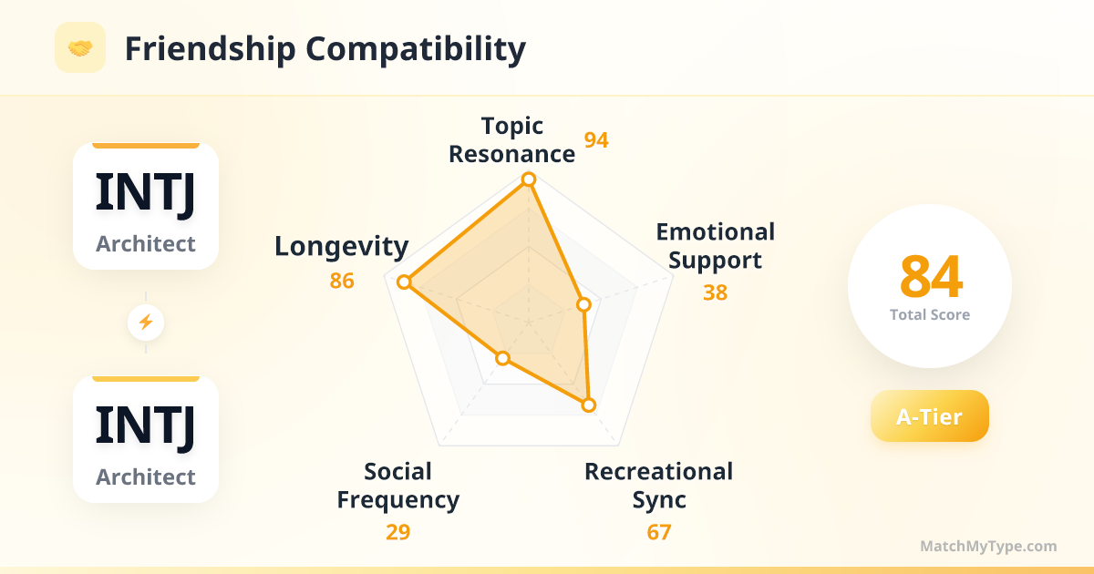 This is a variant of 'narcissism.' An INTJ spends their life searching for someone who can keep up with their processing speed and understand their internal jargon, only to find that another INTJ is the only one who fits. The attraction stems from a rare 'intellectual security'—you don't have to explain your jokes, apologize for your coldness, or hide your ambition. In each other, you see the self that the rest of the world misunderstands, creating a profound sense of belonging.