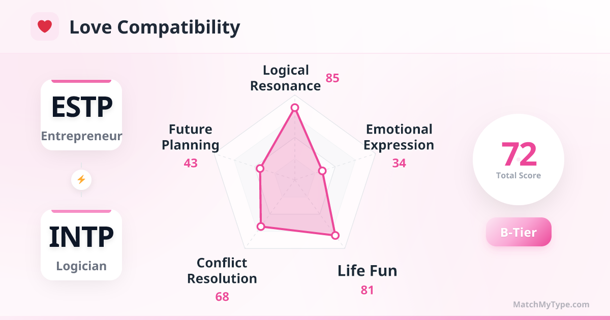 The biggest risk is that both have **Fe (Extraverted Feeling)** in a weak position. ESTP's Fe is for social charm; INTP's Fe is for harmony. Neither is naturally good at handling deep emotional trauma, often choosing to 'avoid' or 'explain pain with logic,' which can leave the relationship lacking emotional depth.
