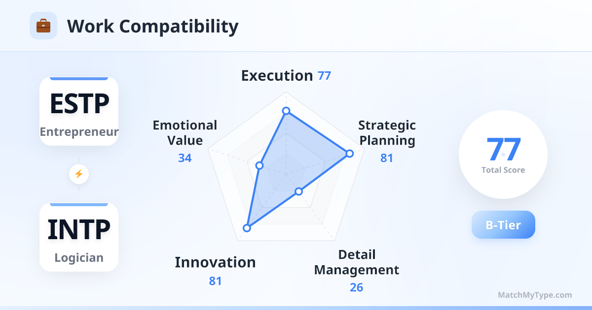 Result-oriented management. The ESTP boss doesn't care when you clock in, only if the problem is solved. This suits INTP perfectly. However, ESTP might change plans on a whim, frustrating INTP's need for logical structure. INTP should learn to iterate fast rather than seek perfection.