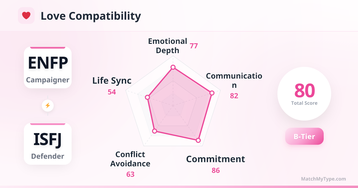 This is a 'Kite and String' dynamic. ENFP is a natural 'Happy Puppy'—enthusiastic but prone to losing control; they subconsciously crave someone to catch them and provide security. ISFJ is that guardian with infinite patience, quietly tidying up the loose ends. While ISFJ's life is usually routine, ENFP breaks the monotony, becoming the light in their predictable world. ENFP enjoys being cared for; ISFJ enjoys being needed. This supply-and-demand relationship is incredibly stable.