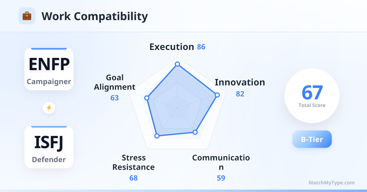ENFP excels at the 0-to-1 creative breakthrough, while ISFJ excels at the 1-to-100 maintenance and execution. ENFP can pitch stunning ideas in a brainstorm, and ISFJ can keenly point out the loopholes in execution, budget issues, and staffing, turning a castle in the sky into a solid building.