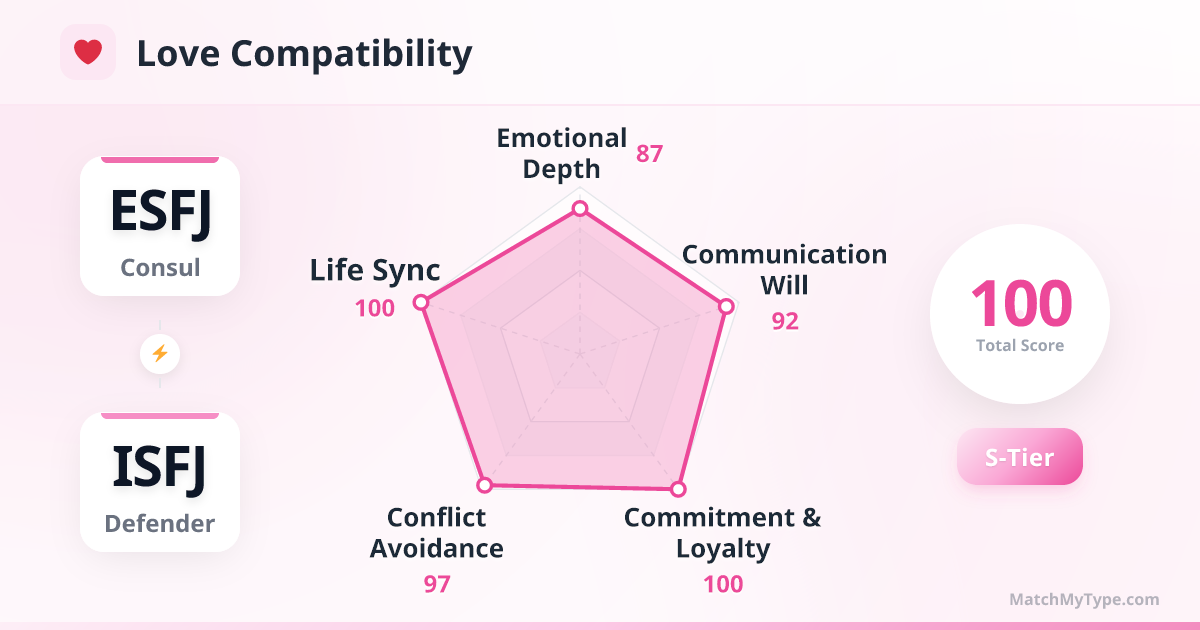 Because you speak the same language. Both ESFJ and ISFJ value detail, tradition, and harmony. ESFJ's warmth breaks through ISFJ's guard, while ISFJ's gentle nature provides a solid backbone. In the early stages, you'll be shocked that they remember the color of your shirt on the first date too, or that they agree that 'replying on time' is basic human decency. This value-level resonance allows you to skip the awkward phase and jump straight into 'old married couple' mode.