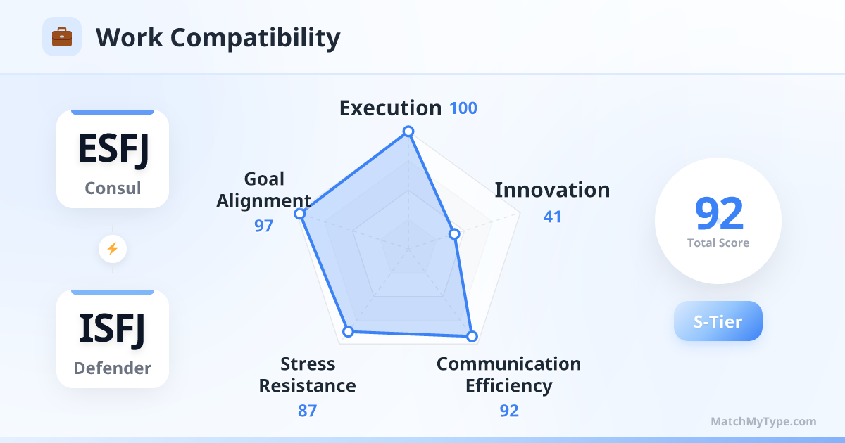 In any organization, the ESFJ-ISFJ combo is the 'backbone.' You are the partners every boss dreams of: high execution, detail-oriented, and team-harmonizing. You don't just 'dream big'; you slice the dream into manageable pieces and distribute them effectively.