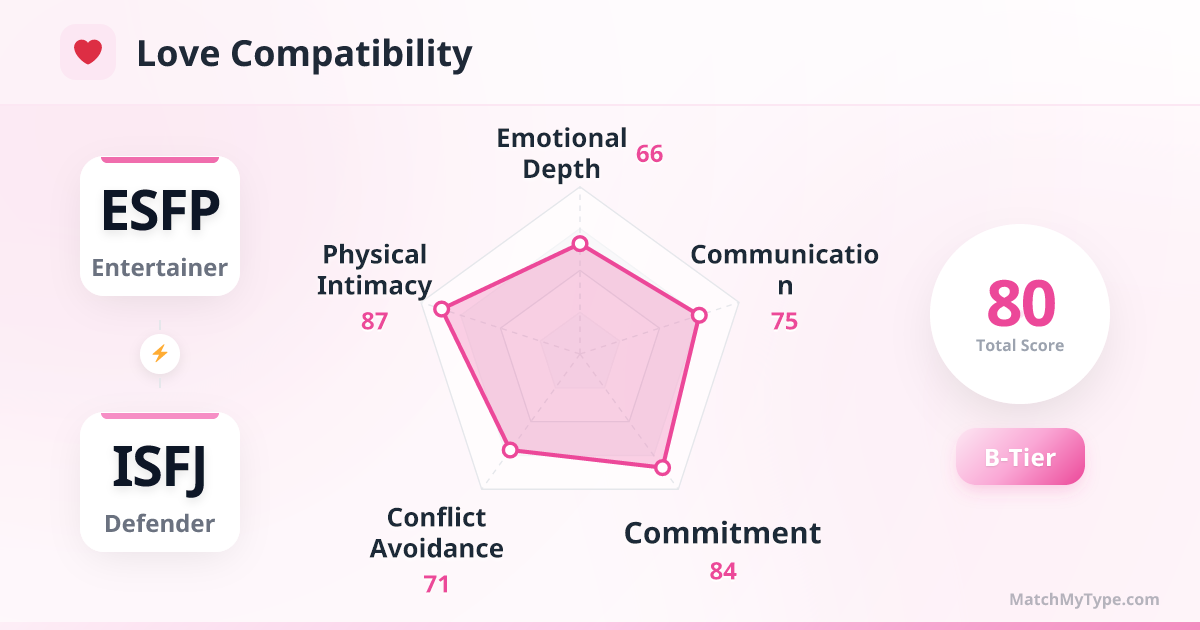 ESFP takes ISFJ to trendy restaurants and events. ISFJ enjoys being led and quietly handles the logistics. Both feel they've found their perfect match.