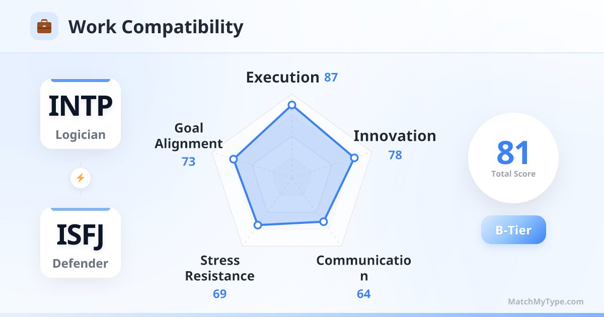 Non-interference is the best state. The INTP handles R&D, while the ISFJ handles admin or client relations. In meetings, the INTP provides the ideas, and the ISFJ turns them into an actionable To-do List. Avoid making them brainstorm together (the ISFJ may struggle to keep up) or do financial reports together (the INTP will make mistakes).