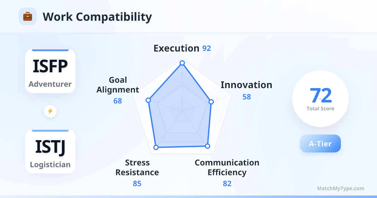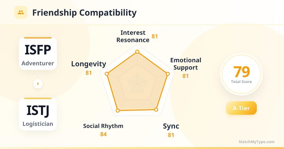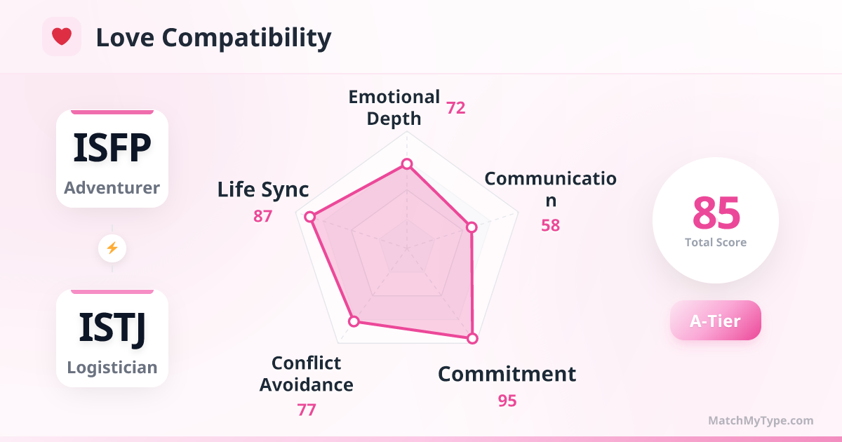 This is a classic 'complementary' pairing. ISFP brings color, emotion, and present-moment joy; ISTJ brings structure, security, and future stability. While one is a spontaneous artist and the other a rigorous administrator, both are pragmatic S-types and reserved I-types, forming a solid foundation of 'silence is golden' understanding.
