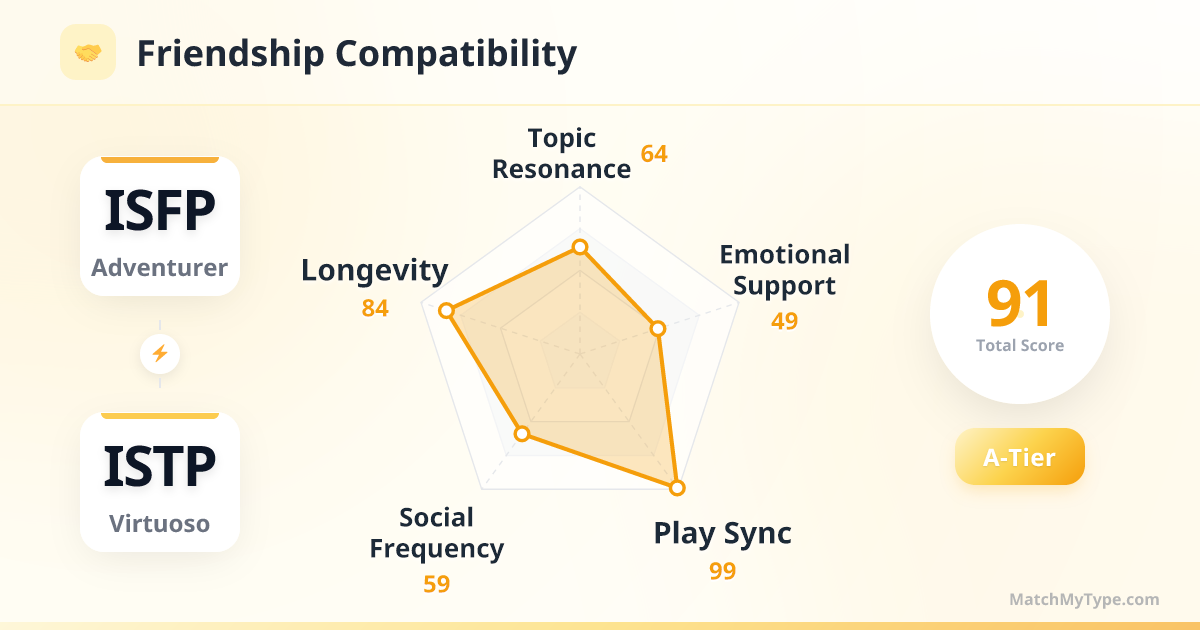 A synchronized special ops team. You excel with clearly divided tasks: ISFP handles the front-end, UX, or styling; ISTP handles the back-end code, structural integrity, or hardware. As long as you don't micromanage each other's expertise, you're a high-efficiency duo.