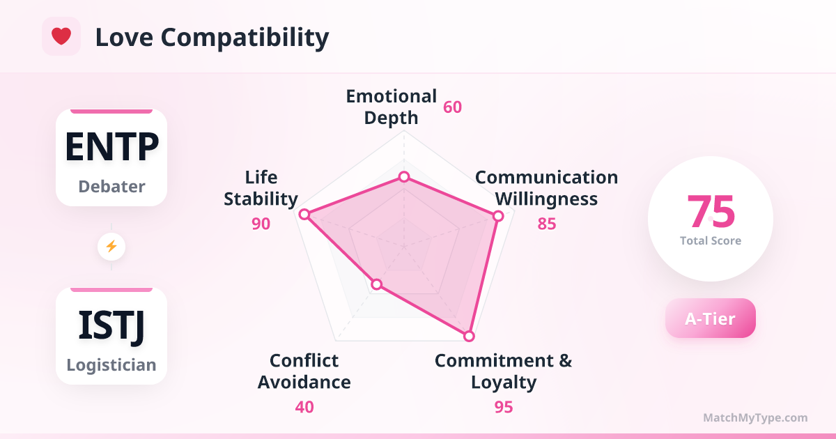 This is a classic 'odd couple' scenario. The ENTP sees the ISTJ as a stiff 'relic,' while the ISTJ views the ENTP as an unreliable 'maniac.' Yet, it is this extreme polarization that creates a lethal attraction. The ENTP brings vibrant color to the ISTJ's black-and-white world, while the ISTJ provides the solid anchor for the ENTP's otherwise drifting existence.