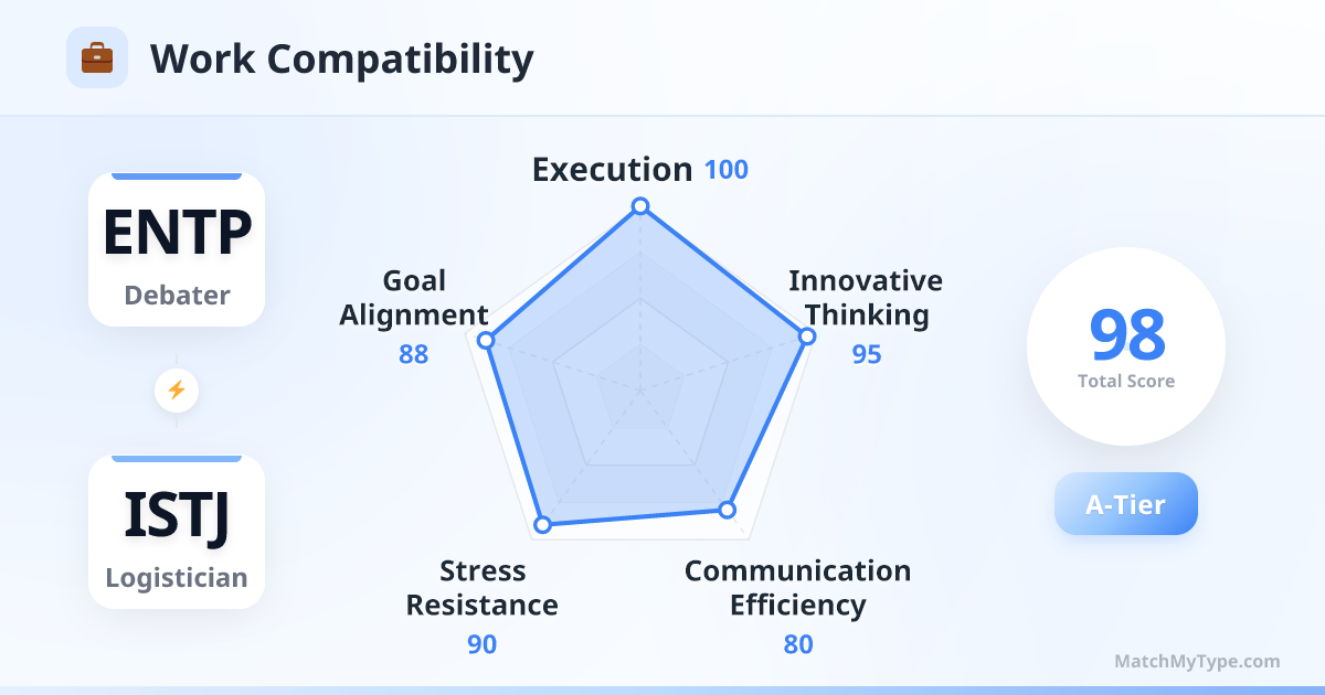 This is one of the most powerful 'entrepreneurial duos' in the MBTI universe. One looks at the stars (strategy), the other looks at the ground (execution). Without the ENTP, the ISTJ might stick to outdated rules; without the ISTJ, the ENTP's company might go bankrupt in three months due to financial chaos.