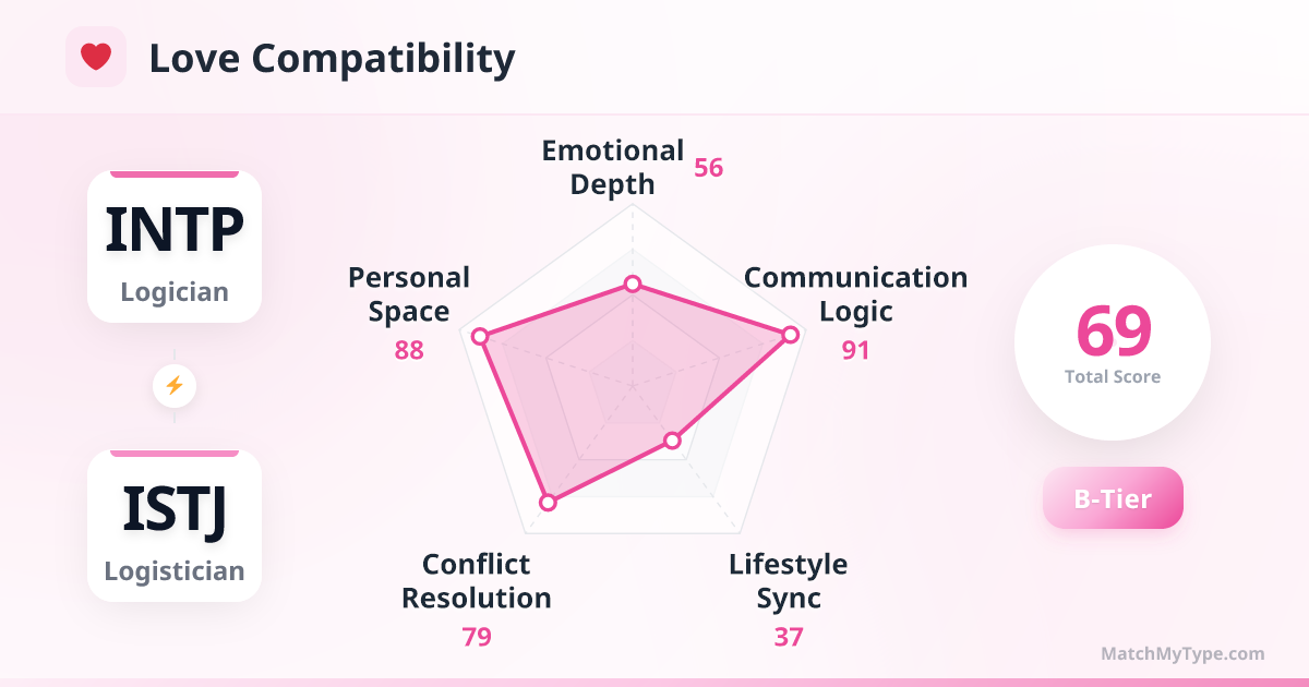 This attraction is built on mutual 'intellectual respect.' INTP admires ISTJ's stability, reliability, and encyclopedic knowledge, seeing them as an anchor in a chaotic world. ISTJ is fascinated by INTP's mental agility, unique perspectives, and ability to solve complex puzzles. Both being introverted thinkers, you enjoy high-quality 'parallel silence'—you're reading, I'm gaming; no talking, just vibes.