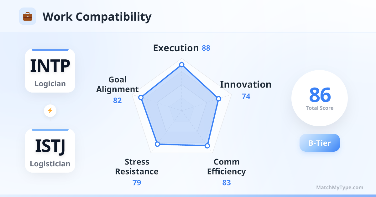 Efficient neighbors. Best used in a 'relay' format: INTP does the research and design, then hands the baton to ISTJ for execution and rollout. Avoid long brainstorming sessions where ISTJ keeps asking 'how do we scale this?' too early.