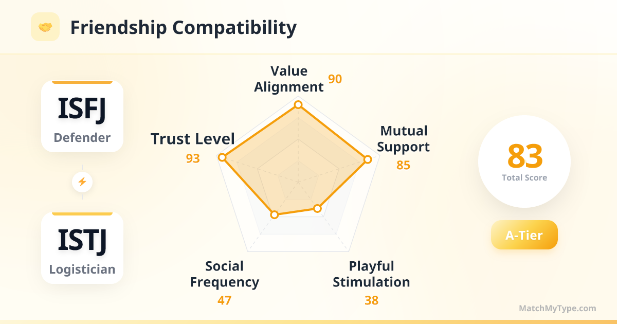 It's the ultimate 'like attracts like' comfort. Both are Introverted Sensors (Si-dominant). In a volatile, uncertain world, they see rare qualities in each other: reliability, punctuality, and a deep respect for tradition and order. The ISFJ admires the ISTJ's steady decisiveness and sense of duty, which provides immense security for the often-anxious ISFJ. The ISTJ is moved by the ISFJ's warmth and their ability to keep life organized, seeing a partner truly built for 'real life.'