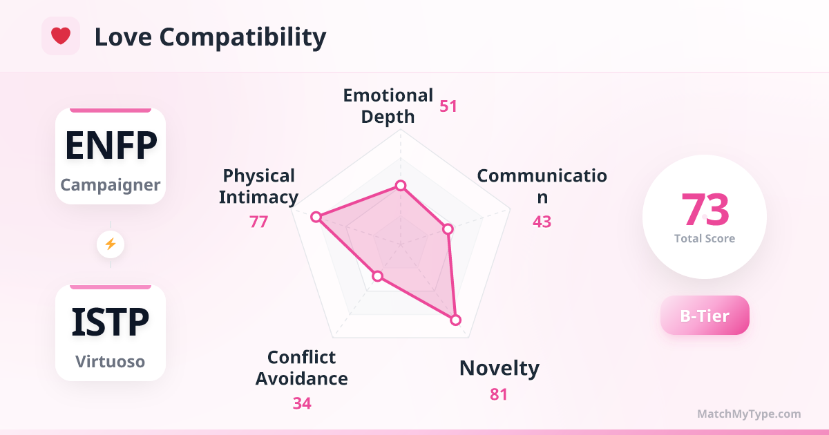 The risk lies in ENFP's hunger for deep emotional validation and verbal affirmation—ISTP's notorious weak spot (Inferior Fe). If ENFP pushes too hard, ISTP will simply 'shut down' or escape.