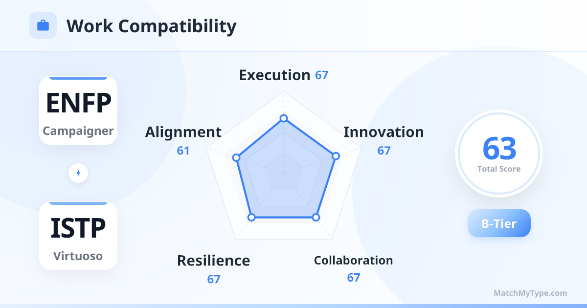 A perfect 'Product + Marketing' combo. ENFP catches market trends, handles clients, and generates brilliant ideas (Ne). ISTP solves technical hurdles, optimizes workflows, and turns vague concepts into tangible results (Ti-Se). ENFP sells the dream; ISTP makes sure the dream actually works.