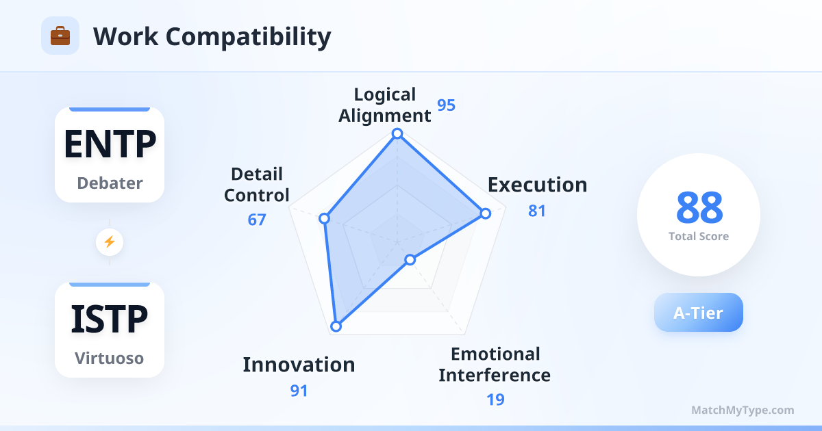 The ultimate tech duo. In IT, engineering, or crisis management, they are unmatched. ENTP handles the clients and resources; ISTP solves the technical nightmares in the back. Rule: ENTP shouldn't micromanage ISTP's process, and ISTP shouldn't crush ENTP's brainstorms.