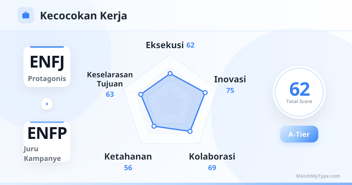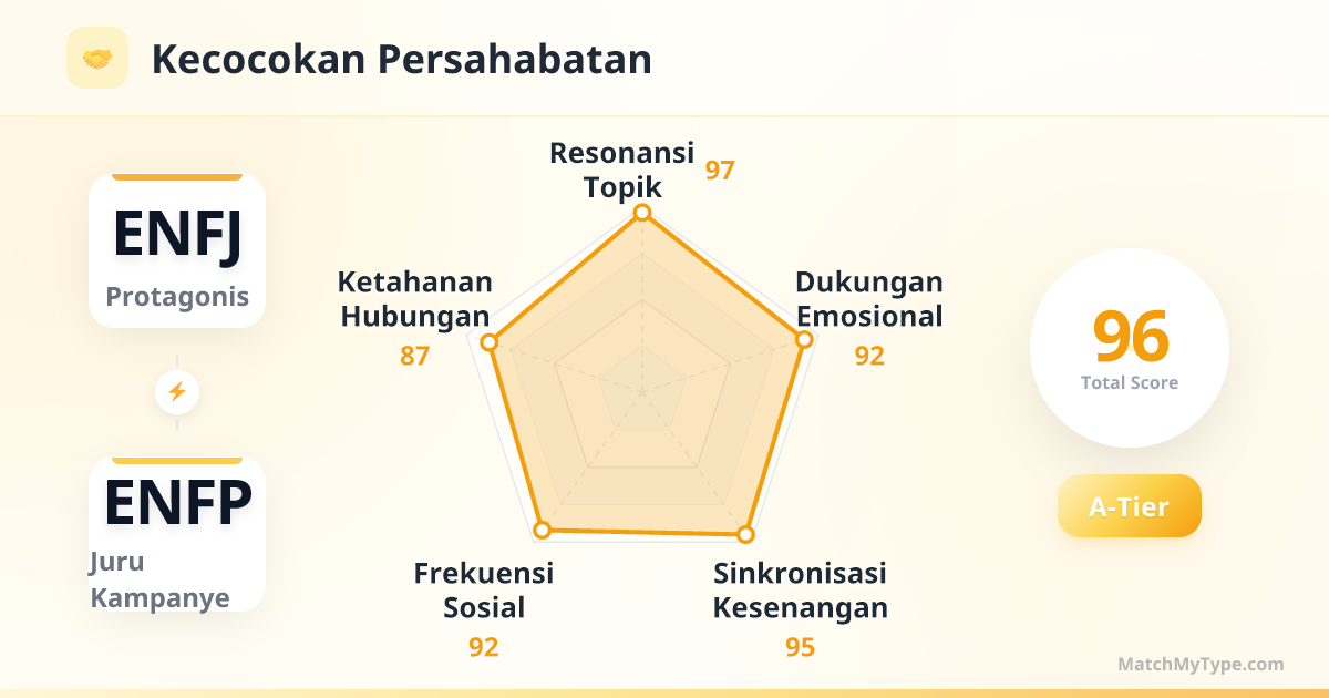 Daya tarik dan inovasi yang luar biasa. ENFP menyediakan aliran ide kreatif yang tiada habisnya (Ne), ENFJ mahir mengintegrasikan ide-ide tersebut dan menjualnya kepada tim atau klien (Fe+Ni). Dalam situasi yang membutuhkan brainstorming, hubungan masyarakat, pemasaran kreatif, atau kegiatan pembangunan tim, kalian adalah mitra emas yang tak terkalahkan.