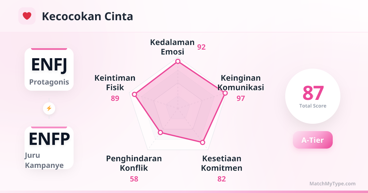 Kombinasi ENFJ dan ENFP seperti dua api yang bertemu, seketika menerangi seluruh ruangan. Ini adalah hubungan yang berenergi tinggi, sangat interaktif, dan luar biasa romantis. Kalian berdua tidak pelit dalam mengekspresikan kasih sayang, tidak takut menunjukkan kerentanan, dan setiap hari yang dihabiskan bersama terasa seperti komedi romantis yang penuh tawa dan air mata.