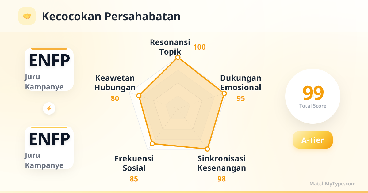 Ini adalah jenis kejutan seperti 'melihat cermin'. Di dunia ini, ENFP sering disalahpahami sebagai 'terlalu berisik' atau 'tidak praktis', tetapi saat Anda bertemu ENFP lain, Anda akan merasakan penerimaan yang belum pernah ada sebelumnya. Kalian bisa langsung nyambung dengan lelucon masing-masing, dan bisa mengobrol mulai dari asal-usul alam semesta hingga makan malam apa nanti. Resonansi mental berdensitas tinggi dan pemahaman tanpa kata ini akan memicu sekresi dopamin yang gila-gilaan, seolah-olah menemukan kembaran yang lama hilang.