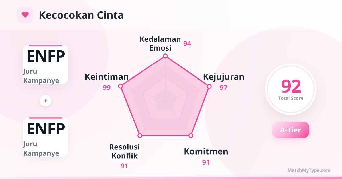Meskipun keduanya adalah tipe ekstrovert (E), ENFP sebenarnya adalah 'E yang paling mirip I'. Kalian berdua membutuhkan banyak waktu menyendiri untuk mengisi ulang energi. Kabar baiknya adalah kalian saling memahami fenomena 'menghilang tiba-tiba' dan 'autisme sesaat' ini. Selama satu pihak mengirim pesan 'saya ingin bersembunyi belakangan ini', pihak lain pasti tidak akan mengganggu dan hanya membalas 'mengerti, kabari kalau sudah kembali'.