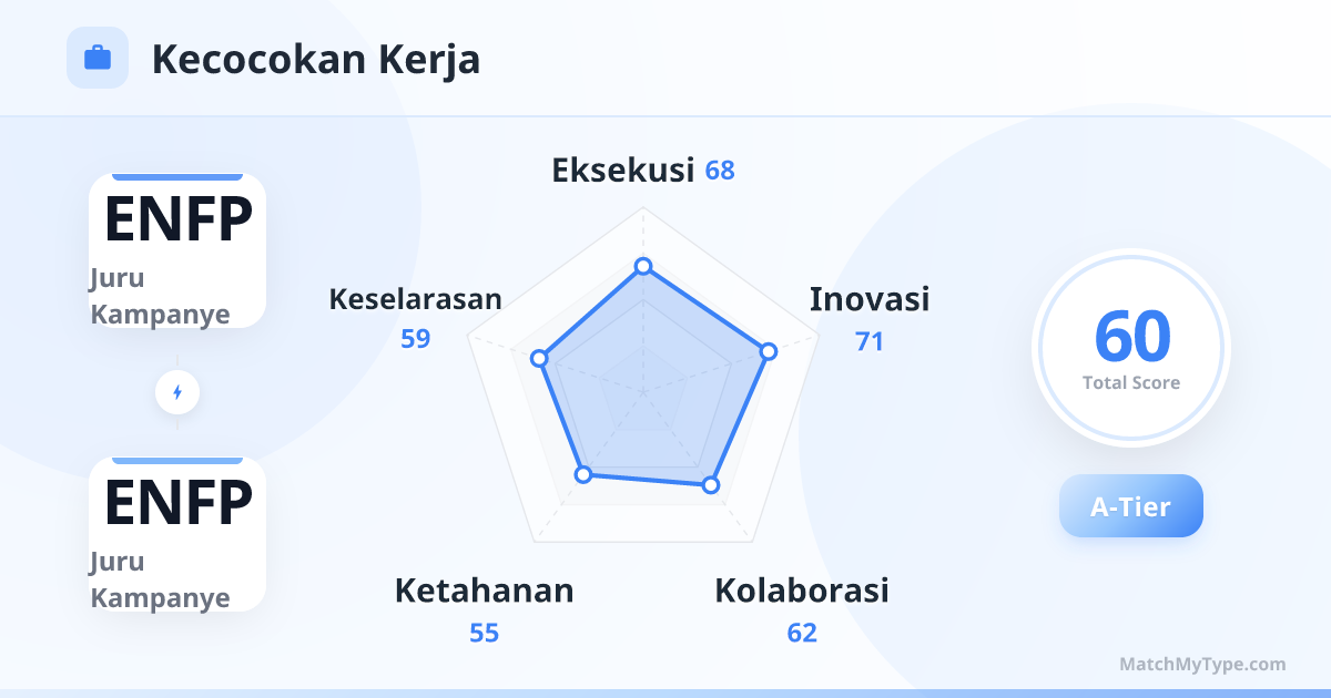 Jika ini adalah rapat curah pendapat (brainstorming), kalian adalah tim impian yang tak terkalahkan; jika ini adalah urusan klaim biaya akhir bulan atau manajemen kemajuan proyek, kalian mungkin menjadi lokasi bencana. Kombinasi kerja ENFP x ENFP penuh dengan inspirasi, tetapi sangat kurang dalam kemampuan eksekusi.