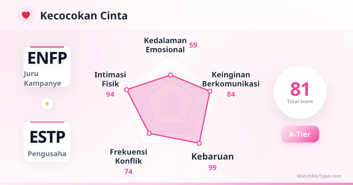 Ini adalah pasangan yang tidak akan pernah merasa bosan. ENFP memberikan naskah, ESTP yang mengeksekusinya. Hubungan kalian seperti film aksi komedi bertempo cepat, penuh tawa, petualangan, dan tikungan tak terduga. Namun saat lampu padam, bagaimana menangani jurang pemisah yang besar antara "emosi" dan "logika" adalah kunci apakah kalian bisa bertahan lama.