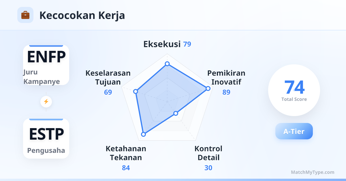 Brainstorming dan monetisasi cepat. ENFP ahli dalam membayangkan rencana pemasaran atau konsep produk yang sangat kreatif melalui Ne, sedangkan ESTP ahli dalam menggunakan Se dan Ti untuk menilai kelayakannya dengan cepat, serta menggunakan jaringan koneksi untuk mewujudkannya menjadi uang. Dalam situasi yang membutuhkan presentasi, roadshow, atau menaklukkan klien besar, kerja sama kalian tak terkalahkan.