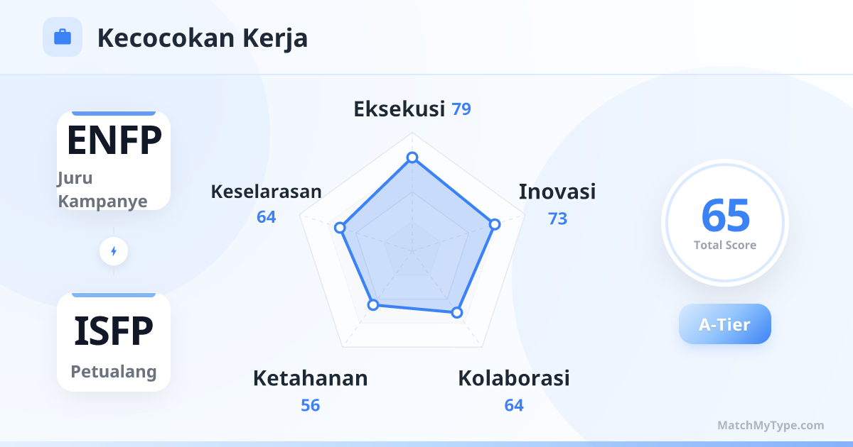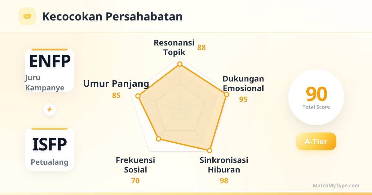 Logika dasar dari hubungan ini adalah **Resonansi Fi** serta **Perbedaan Ne/Se**: **Resonansi Fi (Perasaan Introvert)**: Ini adalah titik koneksi inti kalian. Kalian berdua menempatkan "setia pada perasaan diri sendiri" sebagai prioritas utama. ENFP tahu cara menghargai ruang mandiri ISFP, dan ISFP tahu cara mengagumi nilai-nilai unik ENFP. Kalian jarang mencoba untuk "mengubah" hakikat satu sama lain. **Ne (Intuisi Ekstrovert) vs Se (Penginderaan Ekstrovert)**: Ini adalah titik perbedaan terbesar. ENFP hidup di dunia masa depan dan kemungkinan, suka mendiskusikan konsep abstrak dan kebenaran alam semesta; sementara ISFP hidup di dunia saat ini dan sensorik, lebih peduli pada pemandangan, makanan, dan sentuhan saat ini. ENFP mungkin merasa ISFP "terlalu realistis dan kurang visioner", sementara ISFP mungkin merasa ENFP "terlalu melayang dan tidak realistis".