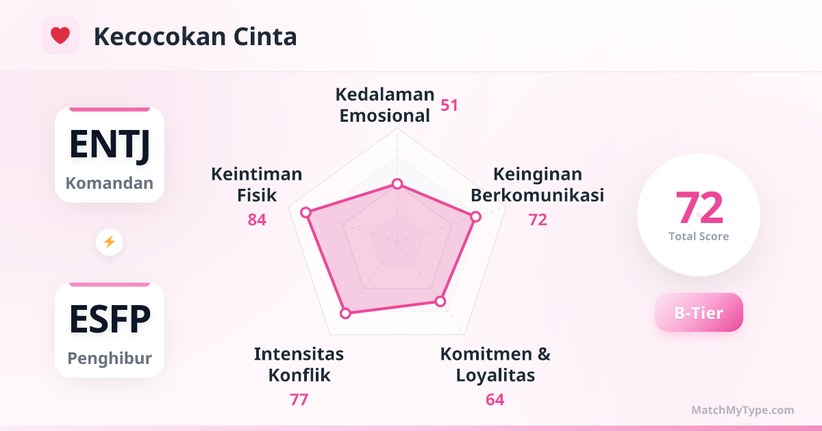 Persaingan dan kerja sama berjalan beriringan. Kalian berdua suka tampil dan memperebutkan kendali. Cara terbaik adalah dengan membagi wilayah: ENTJ bertanggung jawab atas strategi di balik layar, ESFP bertanggung jawab atas presentasi di depan layar. Hindari menjatuhkan satu sama lain di depan umum.