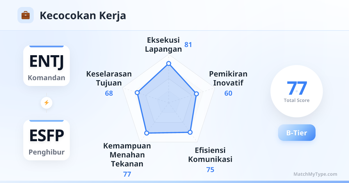 Ini adalah kombinasi antara 'Produser Hollywood (ENTJ)' dan 'Bintang Papan Atas (ESFP)'. Kalian berdua mengutamakan efisiensi, hasil, dan gengsi, serta benci bertele-tele. Selama tujuannya sama, kalian bisa menyapu pasar dengan kecepatan yang sangat tinggi.