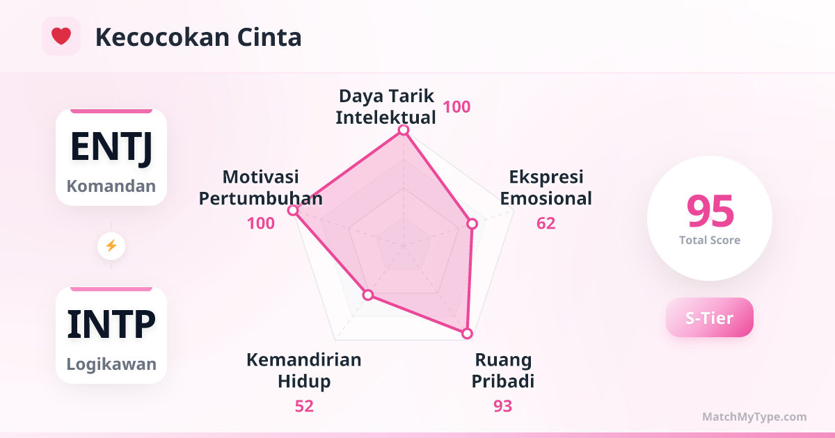 Ini adalah pertarungan antara 'Sang Penakluk' dan 'Sang Pertapa'. ENTJ terbiasa mengendalikan segalanya, namun terkejut menemukan bahwa pikiran INTP sulit ditangkap seperti merkuri dan tidak memiliki celah. 'Tantangan intelektual yang tidak bisa dikuasai sepenuhnya' ini seketika membakar hasrat penaklukan ENTJ. Sementara itu, INTP sering merasa manusia di sekitar mereka membosankan dan tidak cerdas, sampai mereka bertemu ENTJ—seorang yang tidak hanya mengerti logika rumit mereka, tetapi juga bisa membantu mengubah cetak biru dalam pikiran menjadi kenyataan. INTP melihat dorongan aksi yang mereka butuhkan pada ENTJ, dan ENTJ melihat kebenaran yang mereka dambakan pada INTP.