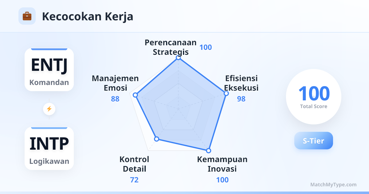 Ini adalah kombinasi 'senjata nuklir' di tempat kerja. Jika ENTJ adalah jenderal yang mengendarai kereta perang, INTP adalah insinyur yang merancangnya. Selama tujuannya sama, tidak ada hambatan yang bisa menghentikan pasangan ini.