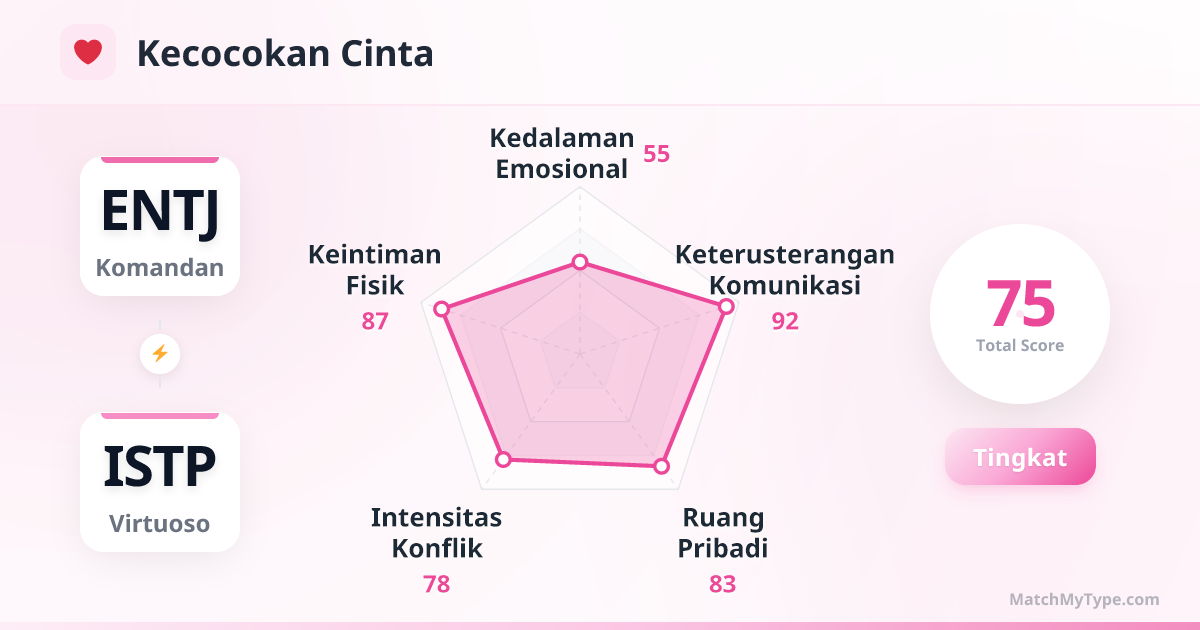 Bukan tidak punya perasaan, tapi memang kurang 'kehangatan'. Cinta mereka diwujudkan dalam aksi: ENTJ membantu Anda menyelesaikan masalah karir, ISTP membantu Anda memperbaiki sirkuit listrik di rumah. Mereka tidak pandai memberikan nilai emosional (seperti membujuk atau berempati). Jika satu pihak mengalami gangguan emosional, pihak lainnya mungkin merasa bingung atau bahkan tidak sabar. Pasangan ini cocok untuk orang yang bermental kuat dan mandiri.