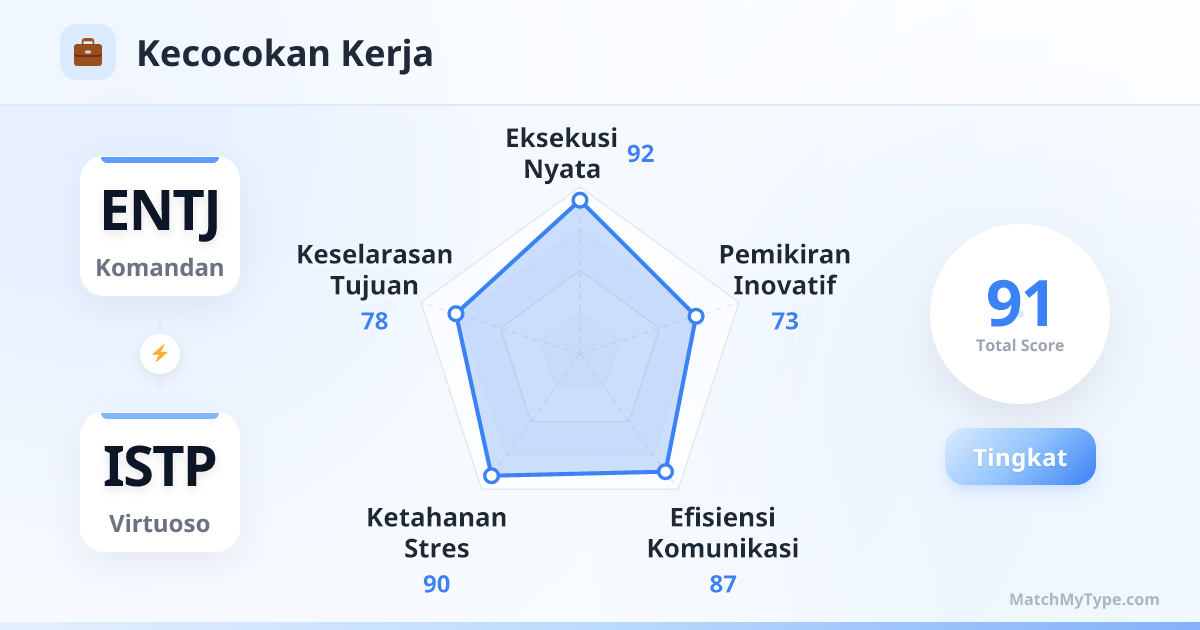 Kombinasi sempurna antara strategi dan taktik. ENTJ ahli dalam tata letak makro, integrasi sumber daya, dan negosiasi eksternal; ISTP ahli dalam operasi mikro, terobosan teknis, dan penanganan krisis. ENTJ menunjuk arah, ISTP menyerang (dengan catatan instruksi ENTJ masuk akal). Dalam bidang teknik, keuangan, bedah, atau awal masa startup, efisiensi kombinasi ini sangat tinggi.