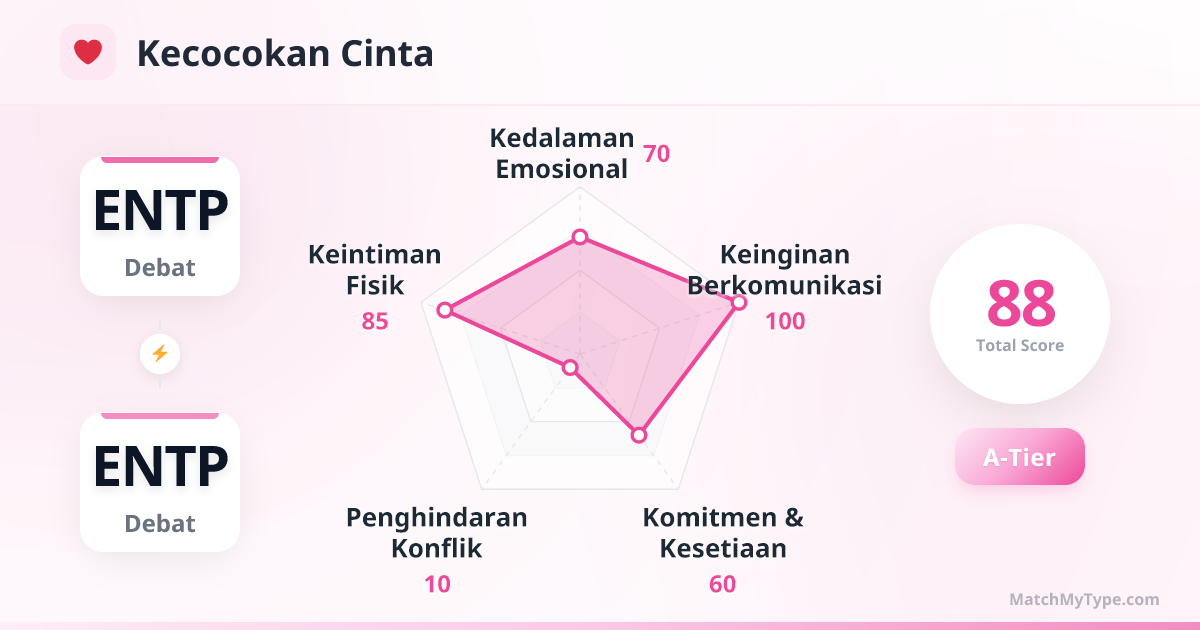 Berpacaran dengan sesama ENTP pada dasarnya adalah bentuk narsisme yang ekstrem—karena Anda jatuh cinta pada versi diri Anda yang 'cerdas, humoris, dan sedikit nakal'. Hubungan ini penuh dengan permainan catur intelektual tingkat tinggi dan humor gelap; Anda adalah sepasang kekasih, rekan konspirasi, sekaligus lawan debat yang paling tangguh bagi satu sama lain.