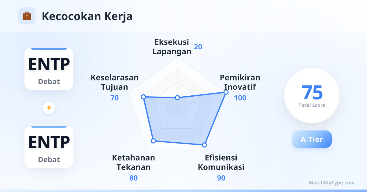 Manajemen gaya bebas. Bos hanya fokus pada arah besar dan visi, tidak peduli prosesnya. Karyawan ENTP akan merasa senang karena memiliki kebebasan tak terbatas. Namun risikonya, mereka bisa mengobrol seharian tentang strategi makro, tapi tidak ada yang menjalankan KPI konkret.