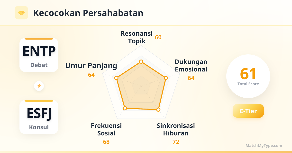 Ini adalah kesalahpahaman umum. ENTP mungkin merasa ESFJ kurang tajam dalam logika abstrak (Ti) atau terlalu mengikuti arus, tetapi ENTP yang matang akan sangat mengagumi kecerdasan sosial (EQ) dan kemampuan eksekusi ESFJ yang kuat. ENTP tahu mereka 'lemah' dalam menangani hubungan antarmanusia dan urusan sepele dalam hidup, sementara ESFJ adalah jenius di bidang itu. Selama ESFJ tidak mencoba menang dalam debat logika, melainkan menunjukkan kemahiran sosial mereka, ENTP akan sangat menghormati.