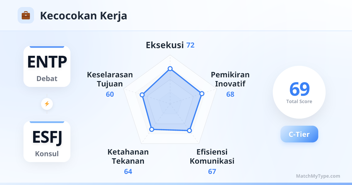 Ini adalah kombinasi antara 'Si Pemimpi' dan 'Si Praktisi'. Di tempat kerja, jika pembagian kerjanya tepat, kalian tidak terkalahkan: ENTP bertugas menciptakan visi, inovasi, dan menaklukkan masalah teknis; ESFJ bertugas mengeksekusi, membangun tim, dan memastikan proyek selesai tepat waktu.