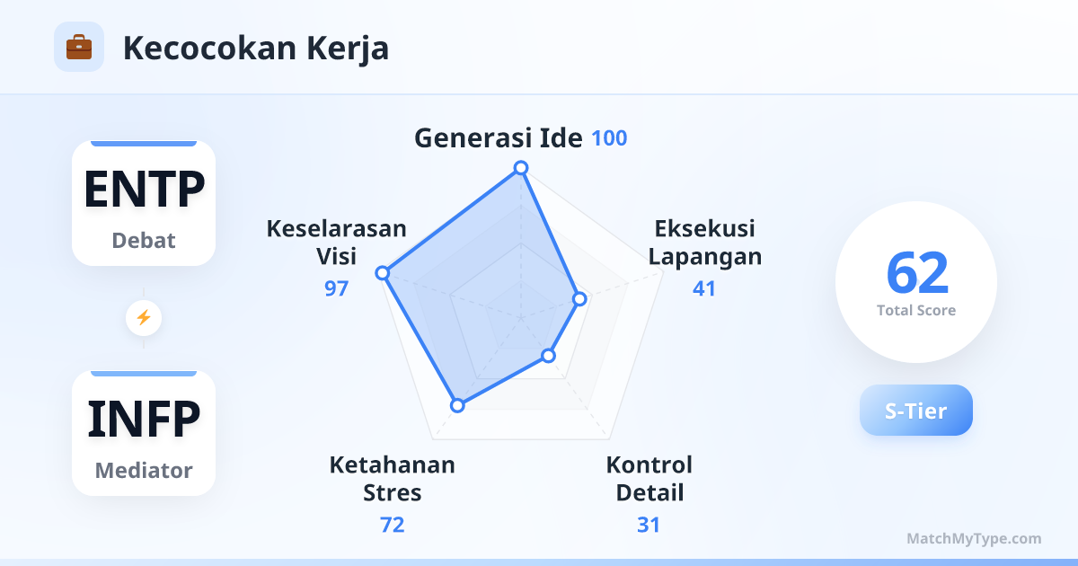 Mesin ide abadi. INFP memberikan inti kepedulian kemanusiaan dan estetika, ENTP memberikan model bisnis yang disruptif dan strategi pemasaran. Dalam sesi brainstorming, Anda berdua saja sudah bisa menandingi seluruh departemen kreatif. Cocok untuk bidang periklanan, media, perencanaan game, kreasi seni, dll.