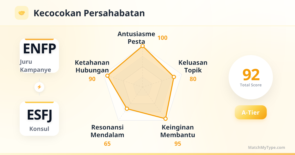 - 3**Ketidaksesuaian kedalaman**: Saat ENFP ingin membahas filsafat alam semesta, ESFJ mungkin hanya ingin bergosip tentang tetangga sebelah. ENFP jangan menganggap ESFJ dangkal karena ini; belajarlah mencari teman bertipe N lain untuk memenuhi kebutuhan intelektual.