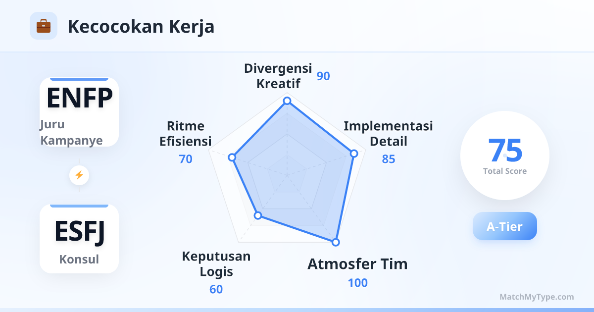 Kombinasi terbaik untuk 'Penjualan + CS' atau 'Manajer Produk + Operasional'. ENFP pandai bercerita, memberikan visi besar, dan menangani klien yang sulit (Ne+Fi); ESFJ pandai menjaga hubungan klien, menangani detail alur kerja, dan memastikan keharmonisan tim (Fe+Si). ENFP membuka wilayah, ESFJ menjaga garis belakang.