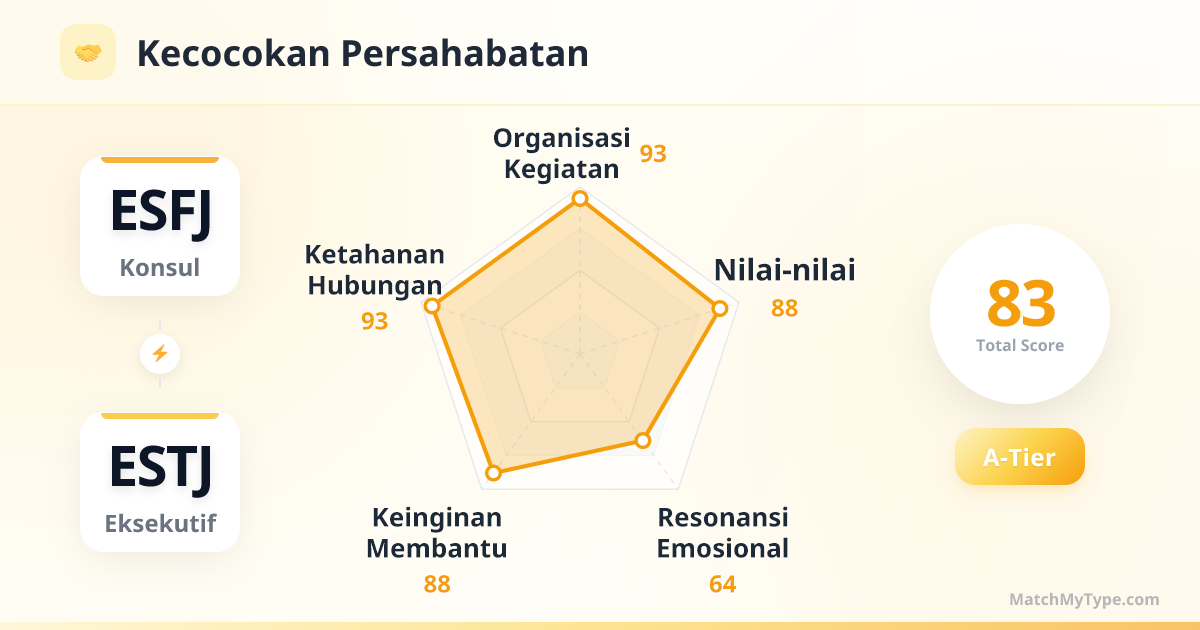 Keduanya adalah tipe SJ (Guardian), yang berarti Anda berbagi sistem operasi dasar yang sama: menghargai tradisi, menghormati aturan, dan mendambakan keamanan. ESFJ akan tertarik pada ketegasan, kemampuan, dan rasa tanggung jawab ESTJ, melihat sosok yang bisa diandalkan; ESTJ akan terpikat oleh kehangatan, perhatian, dan kecerdasan sosial ESFJ yang tinggi, melihat pasangan sempurna yang bisa mengelola rumah tangga dan menjaga reputasi keluarga. Anda berdua tidak menyukai 'kejutan' (yang biasanya dianggap sebagai gangguan), dan lebih suka bertindak sesuai rencana, yang menghilangkan 90% gesekan dalam hubungan.