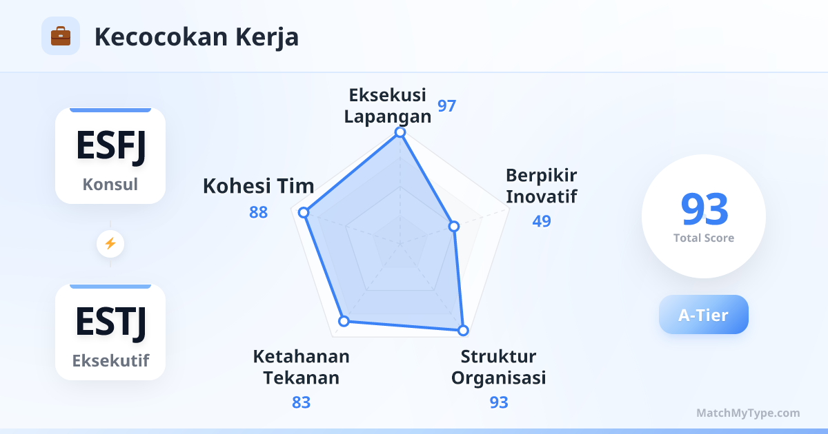 Kombinasi sempurna antara manajemen keras (hard management) + kekuatan lunak (soft power). ESTJ ahli dalam membangun struktur, menetapkan KPI, dan mengoptimalkan proses; ESFJ ahli dalam mengoordinasikan hubungan departemen, menenangkan emosi karyawan, dan menangani klien yang sulit. ESTJ membangun kerangka, ESFJ mengisi daging dan darahnya.