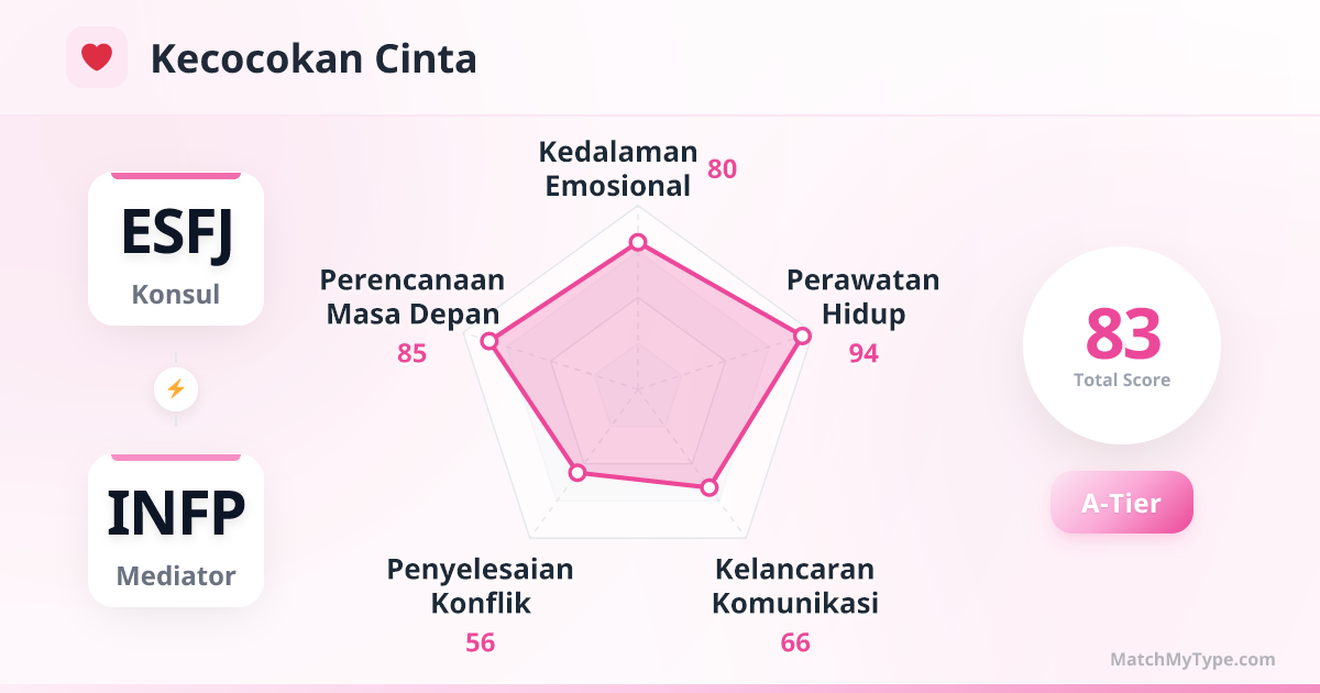 Perlindungan paling nyata bertemu dengan jiwa paling romantis. ESFJ bertanggung jawab memastikan INFP makan dan berpakaian dengan baik, sementara INFP membawa ESFJ melihat bintang-bintang di luar keseharian.