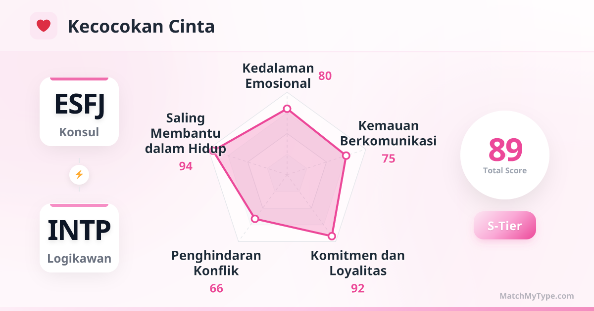 ESFJ membawa INTP kembali ke bumi dengan sup hangat dan pelukan, sementara INTP membawa ESFJ menyentuh bintang dengan logika dan kebenaran. Ini adalah pernikahan sempurna antara kehangatan yang paling membumi dan rasionalitas yang paling murni.