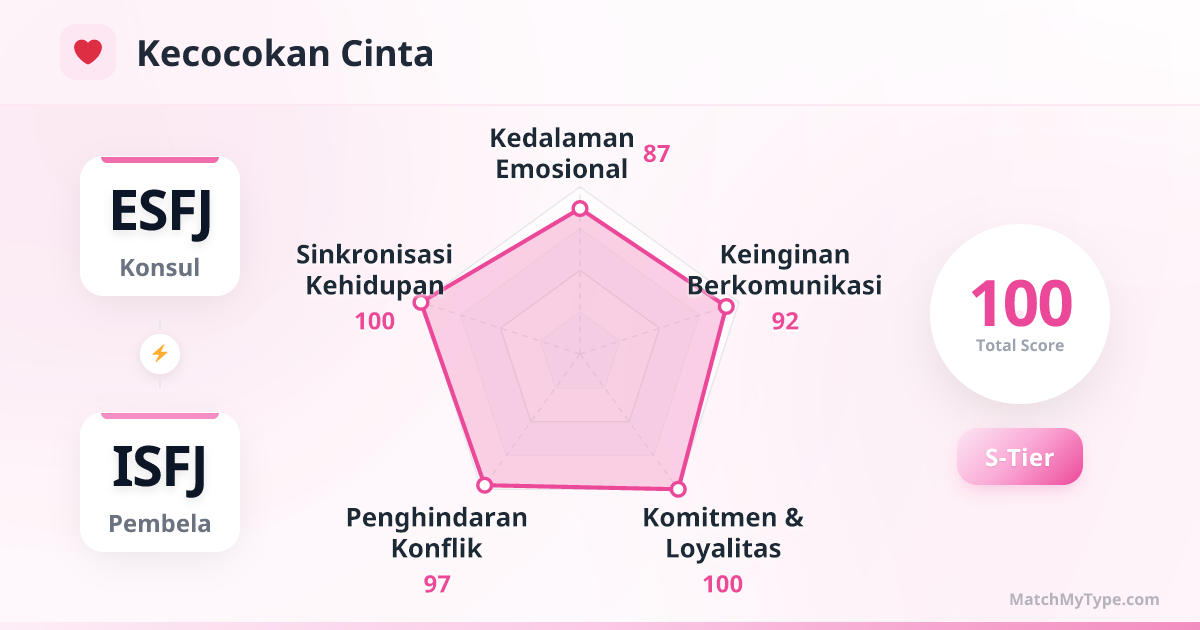 Karena Anda berbicara dalam bahasa yang sama. ESFJ dan ISFJ sama-sama sangat mementingkan detail, tradisi, dan keharmonisan interpersonal. ESFJ yang antusias dan proaktif dapat seketika meruntuhkan pertahanan ISFJ; ISFJ yang lembut dan tertutup dapat memberikan dukungan paling kokoh bagi ESFJ. Di awal masa pacaran, Anda akan terkejut menemukan bahwa pasangan Anda, sama seperti Anda, ingat warna pakaian yang dikenakan saat kencan pertama, atau sama-sama percaya bahwa 'membalas pesan tepat waktu' adalah bentuk rasa hormat yang mendasar. Keselarasan nilai ini memungkinkan Anda memasuki mode pasangan lama tanpa perlu banyak penyesuaian.