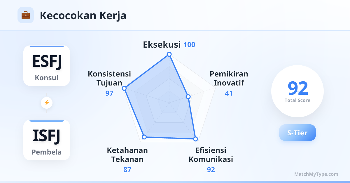 Eksekusi dan pemeliharaan yang ekstrem. ESFJ ahli dalam mengoordinasikan hubungan antarmanusia, mengatur pertemuan, dan membangkitkan suasana; ISFJ ahli dalam memproses dokumen, memverifikasi data, dan menyempurnakan alur kerja. ESFJ menyerang di garis depan, ISFJ menjamin di garis belakang; kombinasi ini hampir tak terkalahkan di bidang administrasi, HR, pendidikan, dan kesehatan.