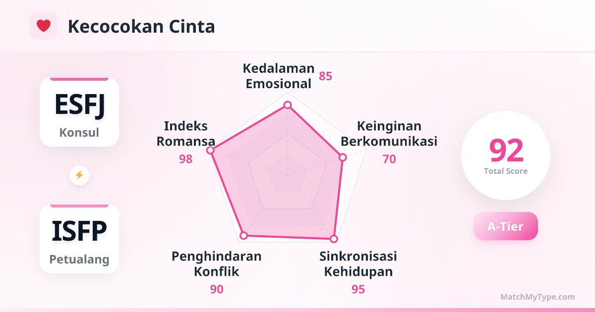 Ini adalah pertemuan antara "Kepala Keluarga" dan "Kucing Manja". ESFJ selalu menunjukkan pesona sosial yang tinggi dan kemampuan merawat orang lain, yang membuat ISFP yang sensitif dan kurang pandai berkata-kata merasa sangat aman dan diterima. Sebaliknya, keunikan, aura artistik, dan kepribadian ISFP yang tidak mengikuti arus sangat menarik perhatian ESFJ yang terbiasa menyesuaikan diri dengan masyarakat. ESFJ ingin melindungi mawar yang unik ini, sementara ISFP merindukan sinar matahari yang hangat ini.