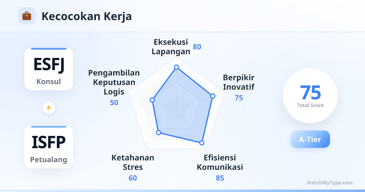 Pasangan pemeriah suasana di kantor. Kalian akan memesan minuman bersama, bergosip, dan mendekorasi meja kerja. Namun dalam proyek kerja sama, pembagian tugas harus jelas: ESFJ bertanggung jawab atas proses dan tenggat waktu, ISFP bertanggung jawab atas konten dan kualitas. Jika tidak, kalian akan cenderung menunda-nunda bersama hingga saat terakhir.