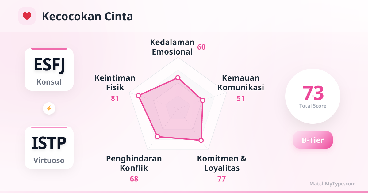Waspadai 'permainan kejar-kejaran'. Semakin ESFJ berusaha memberi dengan keras (Fe) untuk mendekatkan jarak, semakin ISTP merasa sesak dan ingin melarikan diri (Ti/Se). Pola 'kejar-lari' ini adalah pembunuh nomor satu dalam hubungan ini.