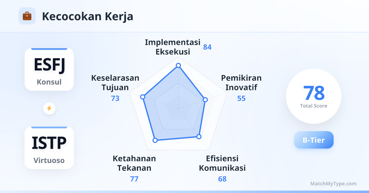 Ini adalah 'kombinasi praktisi' yang sangat efisien. ESFJ ahli dalam menangani 'orang', ISTP ahli dalam menangani 'hal'. Selama pembagian tugas jelas, Anda dapat membangun tim yang memiliki kohesi dan daya tempur.
